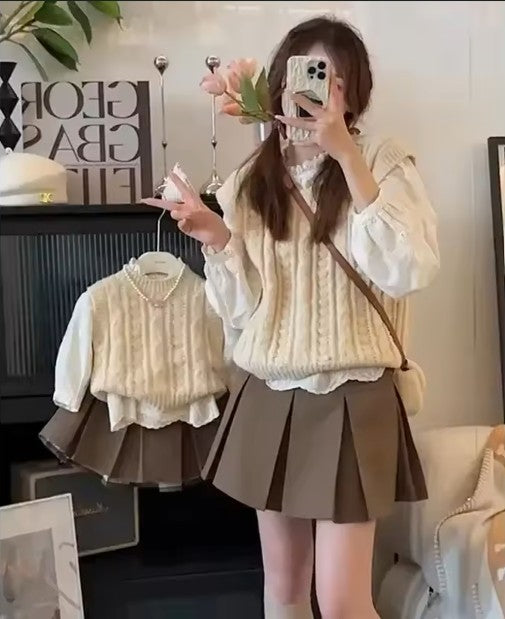 Alleen bij Ziilo vind je deze unieke gebreide set met vest, blouse en rok die moeder en dochter samen laat schitteren.
